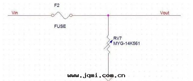 第(dì)二(èr)類(lèi)情(qíng)況是(shì)Vin有(yǒu)電(diàn)网(wǎng)瞬間(jiān)波(bō)動(dòng)大(dà)電(diàn)流过(guò)来(lái),但電(diàn)压是(shì)沒(méi)變(biàn)。这(zhè)时(shí)压敏電(diàn)阻RV8沒(méi)有(yǒu)毀壞,照樣(yàng)工作(zuò)。但保險丝(sī)F3因有(yǒu)大(dà)電(diàn)流經(jīng)过(guò),保險丝(sī)立即就(jiù)熔斷了(le)。後(hòu)邊(biān)的(de)電(diàn)路(lù)得以保護。这(zhè)时(shí)的(de)情(qíng)況就(jiù)是(shì)压敏電(diàn)阻沒(méi)事(shì),保險丝(sī)斷了(le)。