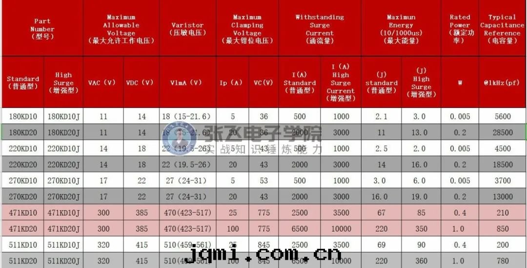 列如(rú)我(wǒ)们(men)常用(yòng)的(de)471 它(tā)的(de)大(dà)允許電(diàn)壓AC300V DC385V同(tóng)时(shí)通(tòng)流量(liàng)也(yě)是(shì)需要(yào)注意(yì)的(de),一(yī)般規格书上(shàng)給(gěi)出(chū)来(lái)的(de)通(tòng)流是(shì)1次(cì)的(de)通(tòng)流量(liàng),我(wǒ)们(men)在(zài)選取(qǔ)的(de)时(shí)候一(yī)定(dìng)需要(yào)留有(yǒu)很大(dà)的(de)餘量(liàng),通(tòng)流量(liàng)是(shì)我(wǒ)们(men)選择直徑的(de)依據(jù),如(rú)果一(yī)个(gè)417KD10 的(de)壓敏電(diàn)阻在(zài)計(jì)算的(de)时(shí)候剛好(hǎo)接近(jìn)規格书上(shàng)的(de)通(tòng)流量(liàng)2500A,我(wǒ)们(men)可(kě)以(yǐ)選取(qǔ)两(liǎng)个(gè)来(lái)並(bìng),如(rú)果空(kōng)间不(bù)夠的(de)时(shí)候我(wǒ)们(men)可(kě)以(yǐ)選择加強(qiáng)型的(de)。