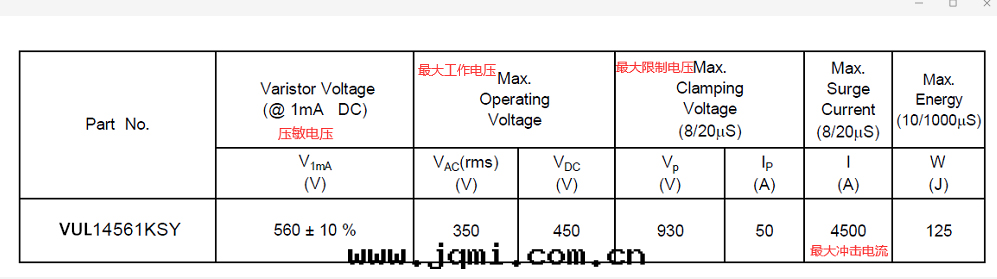2. 關(guān)于压敏選型,例如(rú)220V的(de)工作(zuò)電(diàn)压,由于電(diàn)网(wǎng)有(yǒu)波(bō)動(dòng)因素,我们(men)經(jīng)验(yàn)的(de)需要(yào),加上(shàng)一(yī)个(gè)安(ān)全(quán)系(xì)數。公(gōng)式:220*1.414=311,得出(chū)311V的(de)工作(zuò)電(diàn)压,那麼(me)選用(yòng)的(de)压敏工作(zuò)電(diàn)压就(jiù)要(yào)大(dà)于我们(men)得出(chū)的(de)電(diàn)网(wǎng)工作(zuò)電(diàn)压311V。如(rú)下(xià)图(tú)産品TVR14511KSY的(de)工作(zuò)電(diàn)压VAC是(shì)320V,大(dà)于電(diàn)网(wǎng)工作(zuò)電(diàn)压311V,那麼(me)我们(men)就(jiù)可(kě)以選用(yòng)这(zhè)款压敏電(diàn)阻。但是(shì)根(gēn)據(jù)环(huán)境電(diàn)压波(bō)動(dòng),可(kě)以選用(yòng)工作(zuò)電(diàn)压再大(dà)一(yī)點(diǎn)的(de)压敏電(diàn)阻,如(rú)下(xià)图(tú)産品TVR14561KSY,这(zhè)樣(yàng)就(jiù)会更(gèng)保險。