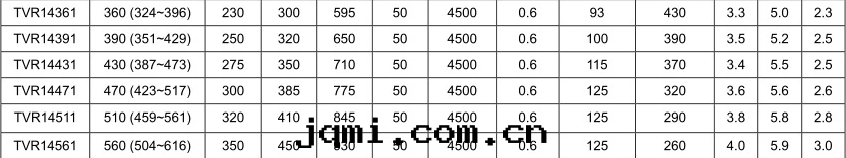 压敏電(diàn)阻片(piàn)徑: Φ14mm 标(biāo)稱压敏電(diàn)压(@1mADC): 360V(324~396)