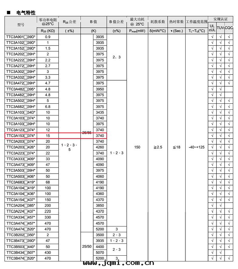 热(rè)敏電(diàn)阻型号(hào)::TTC3A153F374EY |