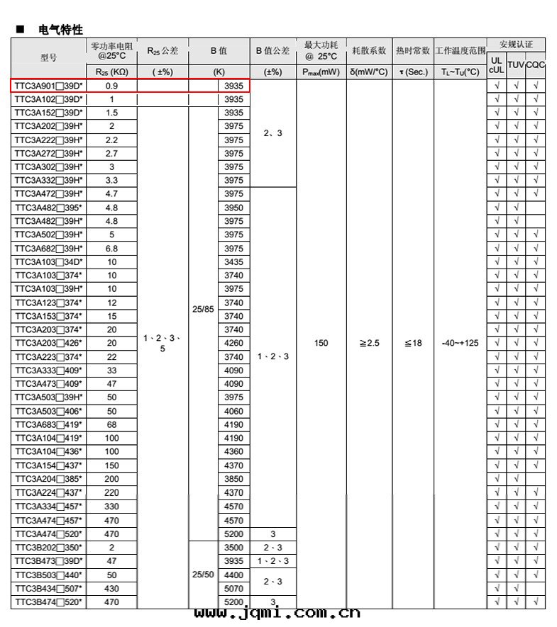 热(rè)敏電(diàn)阻型号(hào)::TTC3A901F39DEY |