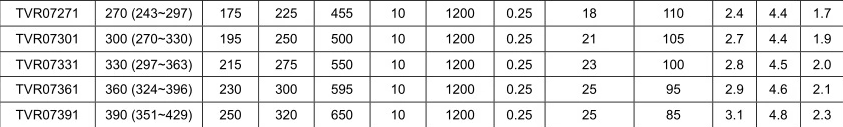 压敏電(diàn)阻片(piàn)徑: Φ7mm 标(biāo)稱压敏電(diàn)压(@1mADC): 390V(351~429)
