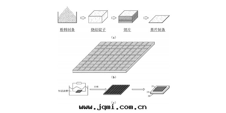 根(gēn)據(jù)材料配方(fāng)将各(gè)種(zhǒng)金(jīn)屬氧化(huà)物(wù)(錳、钴、铁(tiě)、鎳、铜(tóng)、鋅)按照相應(yìng)比例配制得混合物(wù)料;然後(hòu)将物(wù)料倒入(rù)模具中(zhōng),初步手(shǒu)压成(chéng)型後(hòu),在(zài)超高压下(xià)繼續成(chéng)型,得到(dào)錠子;将錠子加入(rù)预先(xiān)鋪好氧化(huà)鋁(lǚ)砂的(de)氧化(huà)鋁(lǚ)缽內(nèi),然後(hòu)用(yòng)氧化(huà)鋁(lǚ)砂填埋錠子後(hòu)進(jìn)行燒结,得到(dào)燒结好的(de)錠子;将錠子固定(dìng)于內(nèi)圆(yuán)切(qiè)割機(jī)專用(yòng)夾具上(shàng),調整參數進(jìn)行切(qiè)割,然後(hòu)用(yòng)純水(shuǐ)超聲清(qīng)洗干淨後(hòu)烘干,得到(dào)热(rè)敏基片(piàn)。