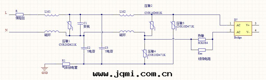 下(xià)图(tú)附上(shàng)一(yī)个(gè)英飛特(tè)IP65驅動(dòng)上(shàng)使用(yòng)的(de)防雷(léi)抗浪湧電(diàn)路(lù)。