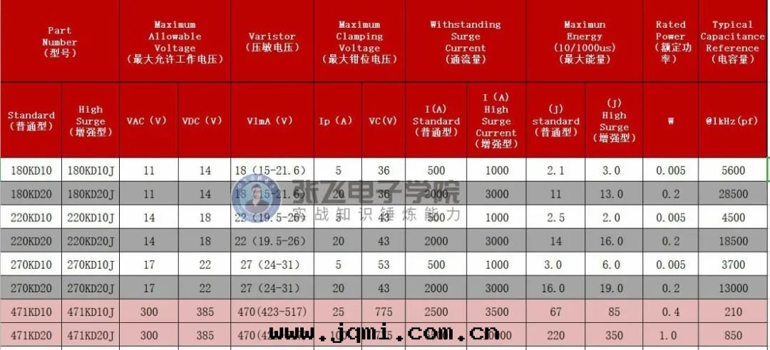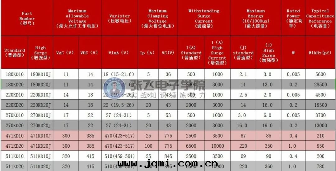 列如(rú)我(wǒ)们(men)常用(yòng)的(de)471 它(tā)的(de)大(dà)允許電(diàn)壓AC300V DC385V同(tóng)时(shí)通(tòng)流量(liàng)也(yě)是(shì)需要(yào)注意(yì)的(de),一(yī)般規格书上(shàng)給(gěi)出(chū)来(lái)的(de)通(tòng)流是(shì)1次(cì)的(de)通(tòng)流量(liàng),我(wǒ)们(men)在(zài)選取(qǔ)的(de)时(shí)候一(yī)定(dìng)需要(yào)留有(yǒu)很大(dà)的(de)餘量(liàng),通(tòng)流量(liàng)是(shì)我(wǒ)们(men)選择直徑的(de)依據(jù),如(rú)果一(yī)个(gè)417KD10 的(de)壓敏電(diàn)阻在(zài)計(jì)算的(de)时(shí)候剛好(hǎo)接近(jìn)規格书上(shàng)的(de)通(tòng)流量(liàng)2500A,我(wǒ)们(men)可(kě)以(yǐ)選取(qǔ)两(liǎng)个(gè)来(lái)並(bìng),如(rú)果空(kōng)间不(bù)夠的(de)时(shí)候我(wǒ)们(men)可(kě)以(yǐ)選择加強(qiáng)型的(de)。