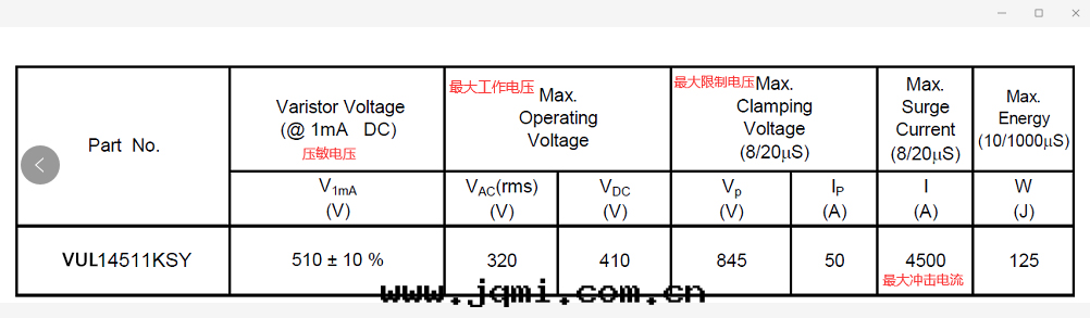 2. 關(guān)于压敏選型,例如(rú)220V的(de)工作(zuò)電(diàn)压,由于電(diàn)网(wǎng)有(yǒu)波(bō)動(dòng)因素,我们(men)經(jīng)验(yàn)的(de)需要(yào),加上(shàng)一(yī)个(gè)安(ān)全(quán)系(xì)數。公(gōng)式:220*1.414=311,得出(chū)311V的(de)工作(zuò)電(diàn)压,那麼(me)選用(yòng)的(de)压敏工作(zuò)電(diàn)压就(jiù)要(yào)大(dà)于我们(men)得出(chū)的(de)電(diàn)网(wǎng)工作(zuò)電(diàn)压311V。如(rú)下(xià)图(tú)産品TVR14511KSY的(de)工作(zuò)電(diàn)压VAC是(shì)320V,大(dà)于電(diàn)网(wǎng)工作(zuò)電(diàn)压311V,那麼(me)我们(men)就(jiù)可(kě)以選用(yòng)这(zhè)款压敏電(diàn)阻。但是(shì)根(gēn)據(jù)环(huán)境電(diàn)压波(bō)動(dòng),可(kě)以選用(yòng)工作(zuò)電(diàn)压再大(dà)一(yī)點(diǎn)的(de)压敏電(diàn)阻,如(rú)下(xià)图(tú)産品TVR14561KSY,这(zhè)樣(yàng)就(jiù)会更(gèng)保險。