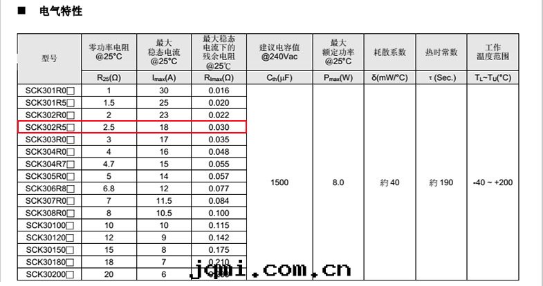 热(rè)敏電(diàn)阻: VT 热(rè)敏電(diàn)阻型号(hào): SCK302R5MSY 热(rè)敏電(diàn)阻片(piàn)徑: Φ30mm 零(líng)功率電(diàn)阻@25℃: 2.5Ω 工作(zuò)温(wēn)度(dù)範圍: -40℃±200℃ 儲存温(wēn)度(dù)範圍: -40℃±85℃